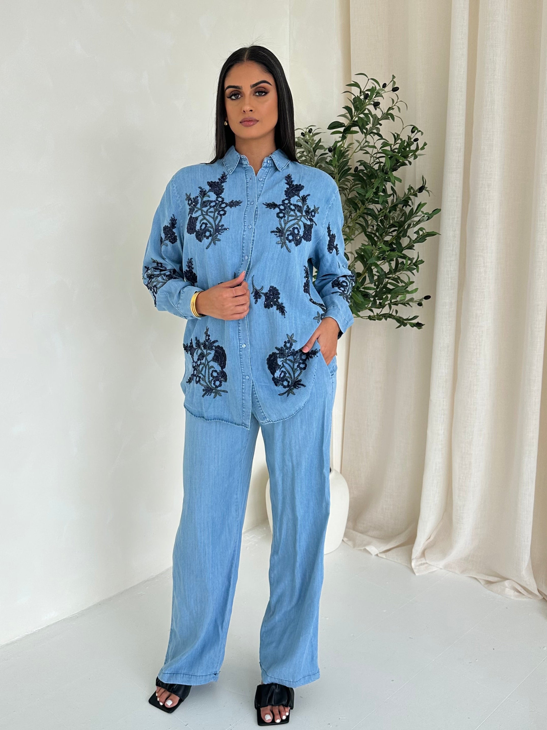 The Bella Co-Ord Set is where relaxed tailoring meets bold elegance. Crafted from 100% high-quality cotton, this two-piece set delivers breathable comfort with a polished edge. The relaxed-fit shirt features striking floral embroidery, adding a touch of statement detail to an otherwise timeless silhouette.