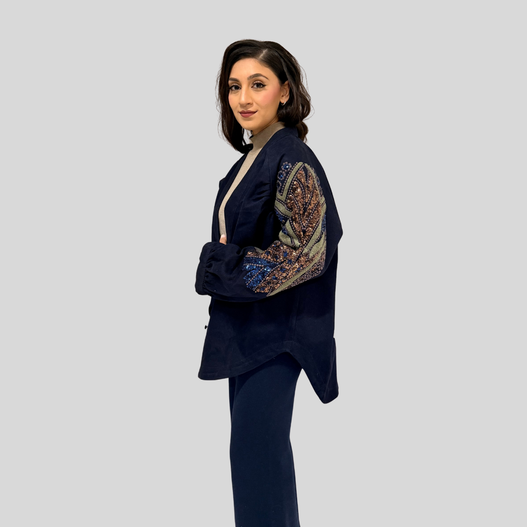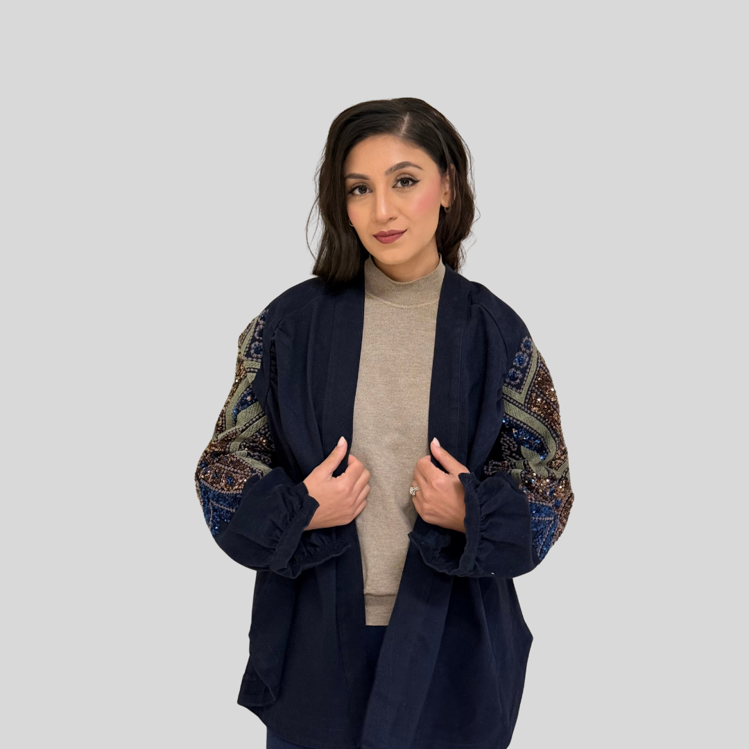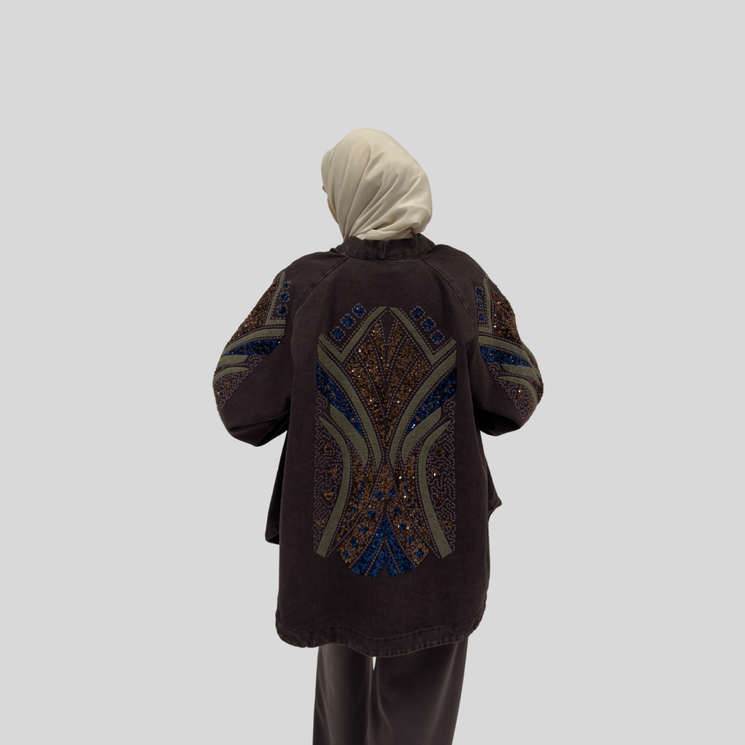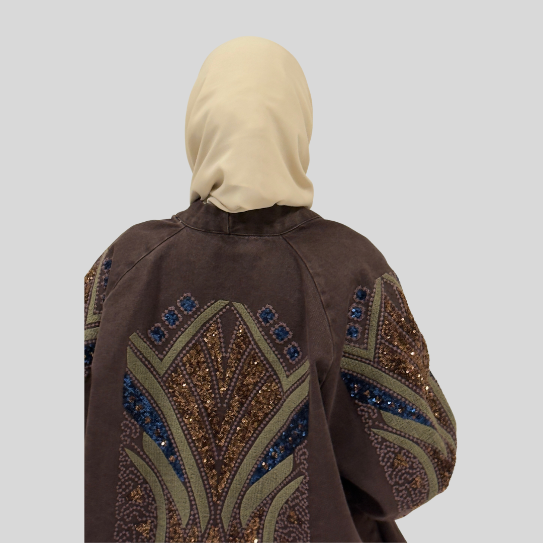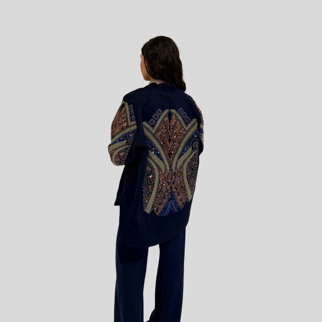 Step into a realm of refined sophistication with the Mirage Embellished Kimono — a signature piece that fuses artisanal embellishment with timeless design. Inspired by desert landscapes and nature’s organic patterns, this kimono features intricate hand-placed sequins and embroidery that shimmer with every movement.