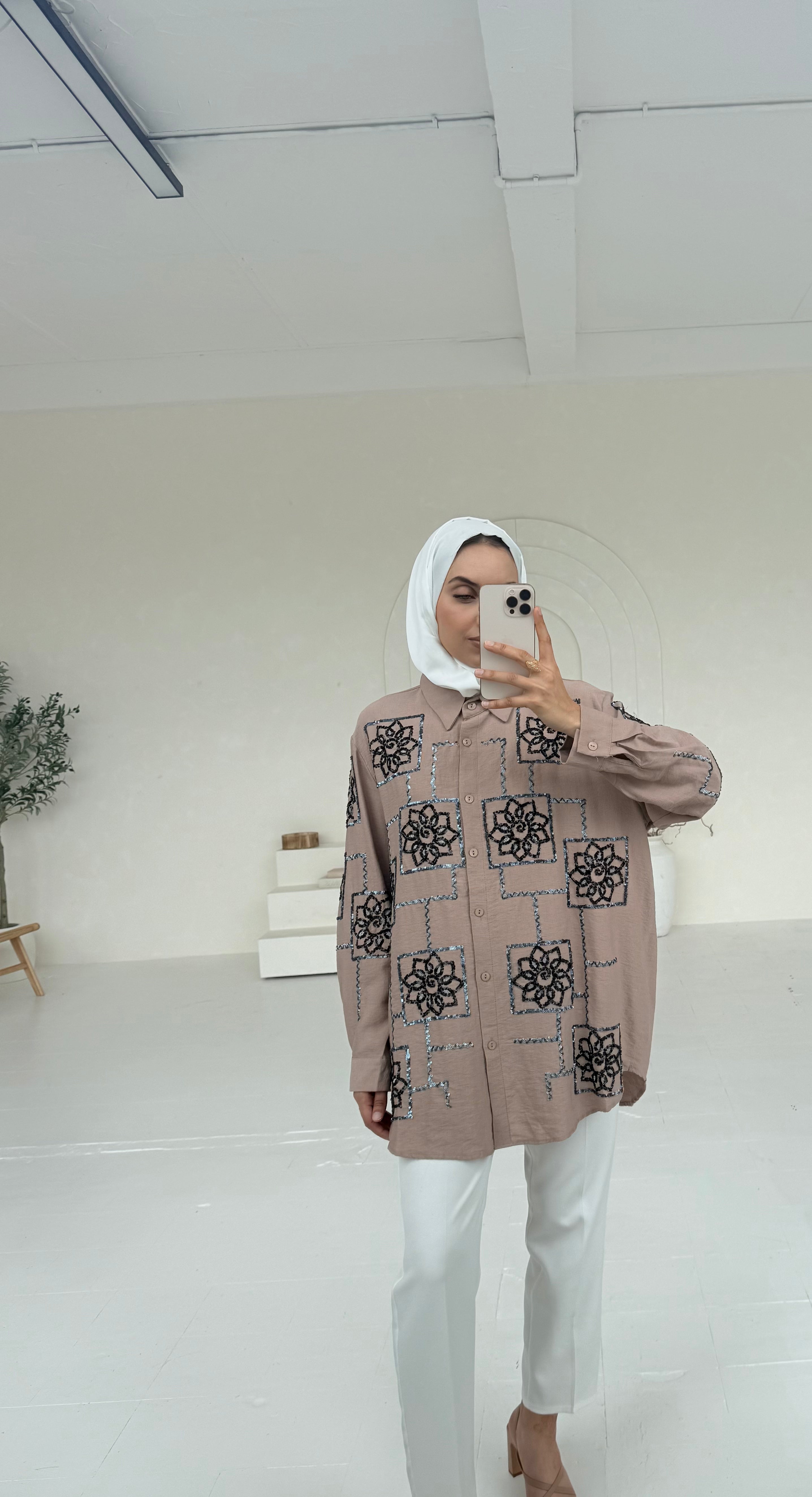 Elevate your wardrobe with the Grid Lace Embellished Shirt – a refined blend of bold structure and delicate detail. Featuring intricate black floral lace set within embroidered grid panels, this design plays with contrast to deliver a look that’s both striking and timeless.