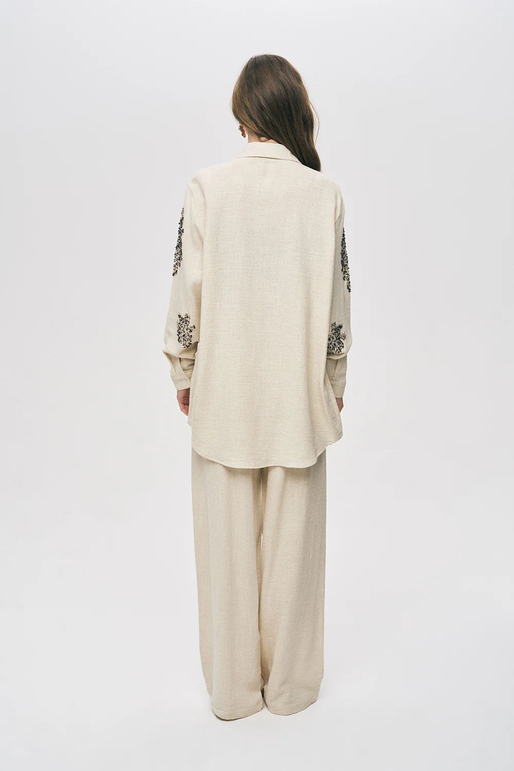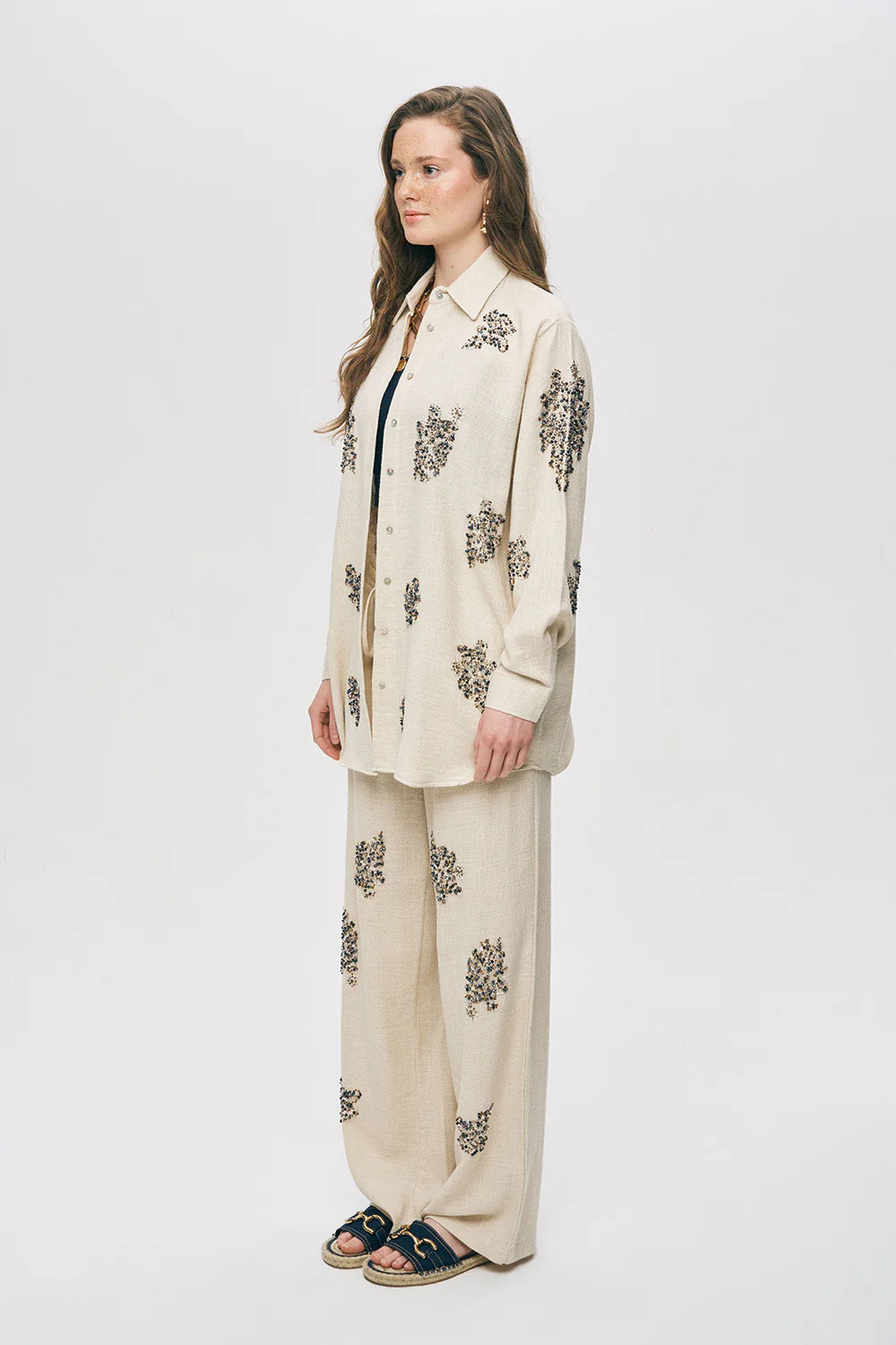 The set features a relaxed, oversized button-down shirt paired with fluid, wide-leg trousers. Both pieces are adorned with intricate, hand-inspired floral clusters in a burnished metallic palette, mimicking wildflowers caught in the golden hour glow.