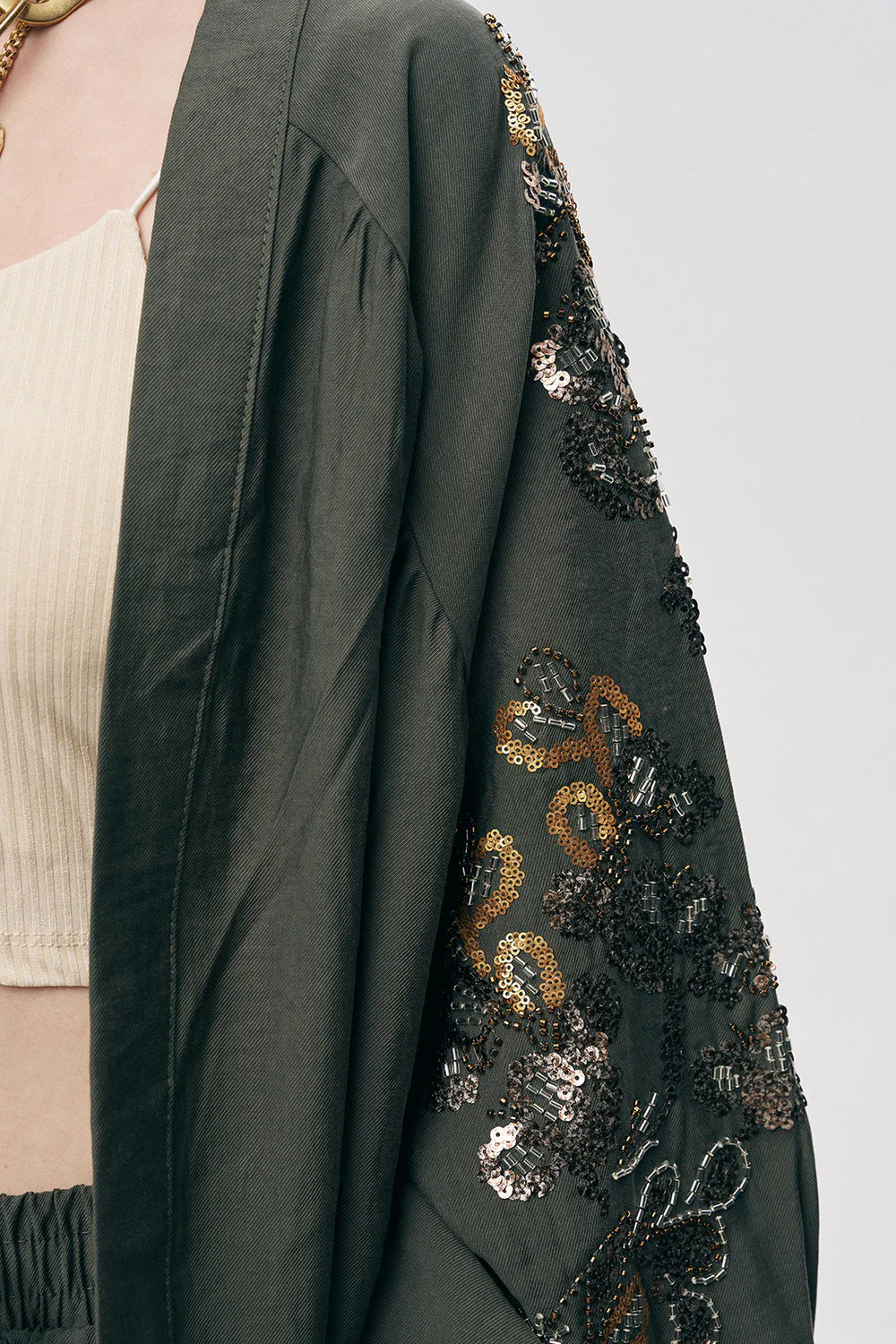 Experience the intersection of nomadic soul and modern refinement with The Gilded Olive Embellished Set. Designed for the discerning individual, this ensemble is a masterclass in artisanal luxury, balancing a deep khaki palette with radiant hand-finished detailing.